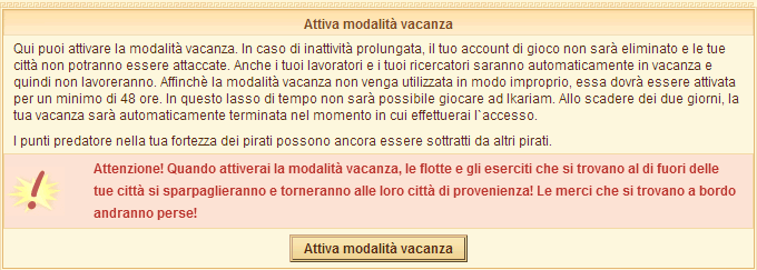 Quando entrerai in Modalità Vacanza uscirai immediatamente dal tuo account. Solo quando effettuerai nuovamente il login il tuo account sarà ri-attivato: questo comunque e' possibile solo dopo due giorni dall'inizio della Modalità Vacanza.. Durante questo tempo le tue città saranno protette dagli attacchi , tuttavia non produrrai nessuna risorsa. I tuoi Punti Predatore (relativi alla Fortezza dei Pirati) saranno comunque soggetti a razzia da parte di flotte di pirati nemiche.