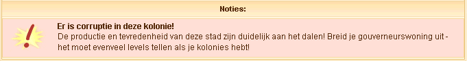 Er is corruptie in deze kolonie. Je kan deze notie laten verdwijnen door je gouverneurswoning uit te breiden waardoor de corruptie zal dalen.