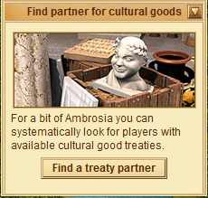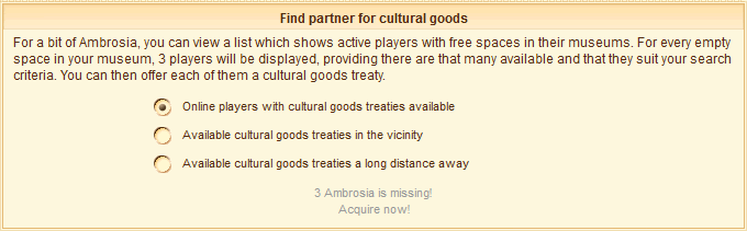 Using this feature, you can get a list of maximum (number of free slots you have available * 5) players that have an available Cultural Asset Treaty, online in the past 5 days and not in vacation mode, and make offers up to (number of free slots you have available * 3) players. You can also set different criteria about the players to whom you want to offer cultural treaty agreement (eg. players located next to you, far away from you, etc). This feature is avalable in the Museum.