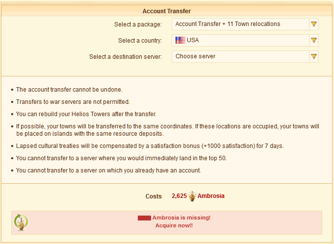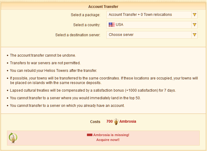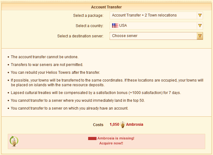 If you purchase your account transfer together with some town relocations in one package, each town relocation will cost you 175 Ambrosia."