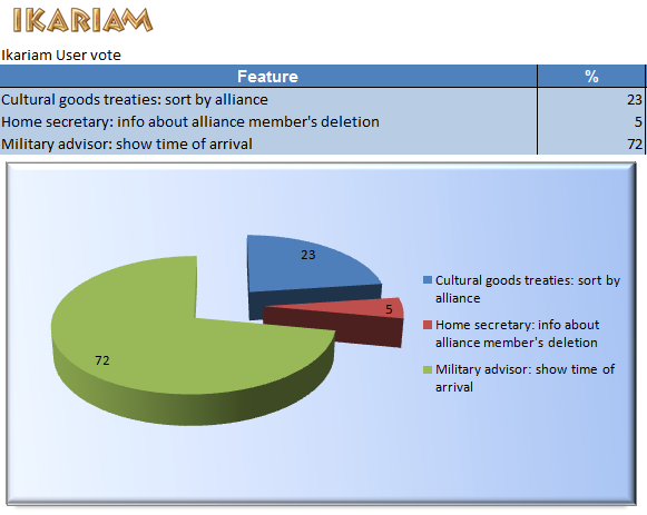 In order to do so we will make a user vote once a month giving you the choice between 3 features. The winning feature will be included in the next update. This vote takes place once a month in ALL Ikariam communities, meaning: all votes will be summed up and added to the global vote result.